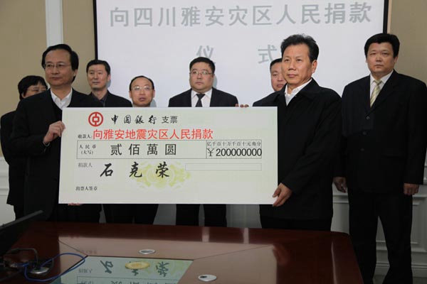 三河汇福粮油集团向雅安地震灾区捐款500万元,其中集团党委书记、董事长、总裁石克荣个人捐款200万元。